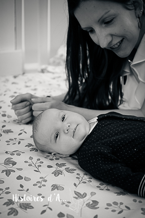 Je propose ensuite à Isabelle de continuer la séance photo à l’étage, pour plus d’intimité. Isabelle allaite Lisa et c’est donc tout naturellement que ce moment prend de la place lors de la séance. Ce temps à la fois naturel et essentiel qu’est l’allaitement est un moment important que je propose toujours de photographier. Isabelle a choisi de revêtir la tenue qu’elle portait lors de sa séance grossesse. Il y a énormément de douceur dans ces images et j’espère que dans quelques années, ces photos remémoreront ces instants d’émotion à Isabelle.